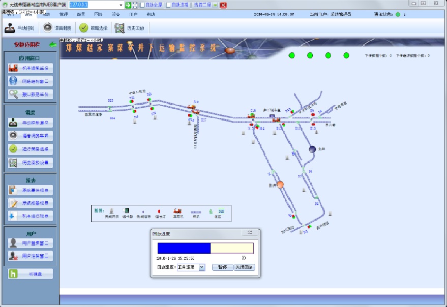 3、可視化監視功能:在計算機上以動畫、圖形、表格、漢字等形式實時顯示機車位置、車號、運行方向、機車運行速度以及井下各道岔和信號燈等運行狀態信息。